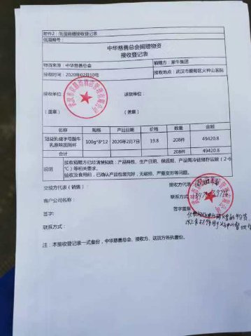 圖說:蒙牛為火神山醫院捐贈物資的接收登記表