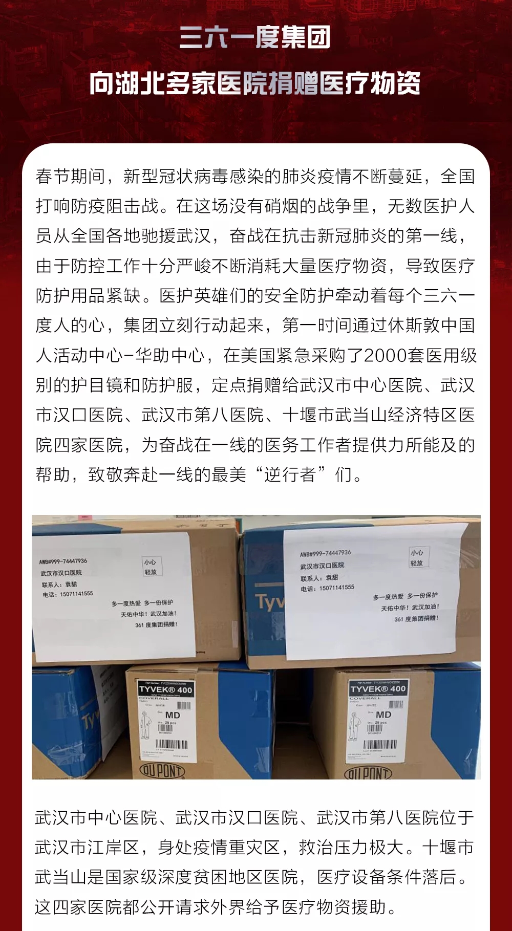 三六一度:情系武漢共抗疫情,三六一度向湖北多家醫院捐贈醫療物資