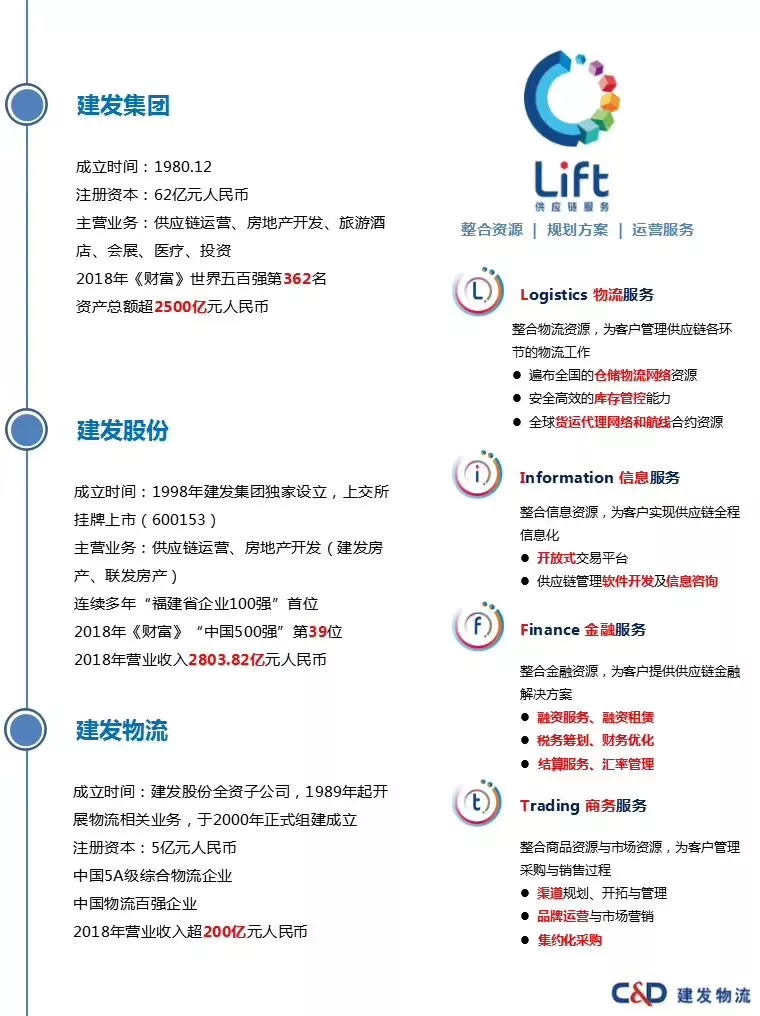 廈門建發股份有限公司獨家設立的子公司,自1989年開展物流相關業務,注冊資金5億人民幣,現已發展成為年營業額超200億、員工數超500人的中國5A級綜合物流企業,同時也是中國百強物流企業、全國先進物流企業、福建省示范物流企業、廈門市重點物流企業,2018年納稅額超億人民幣。母公司廈門建發集團創立于1980年12月,三十多年來形成了以供應鏈運營、房地產開發、旅游酒店、會展業、投資等產業為核心的福建省大型實業投資企業集團,2019年位列世界五百強277位、中國企業五百強77名、中國服務業五百強39名。