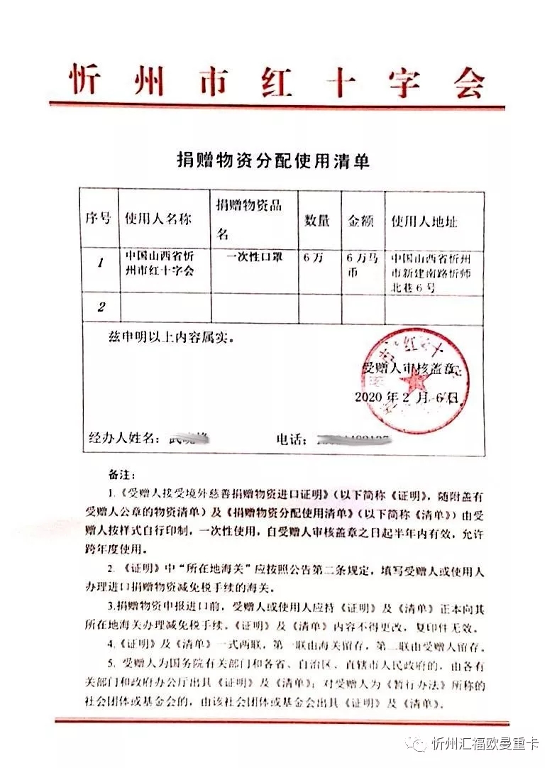 2月5日,忻州匯福汽車銷售服務有限公司呂總從馬來西亞緊急采購六萬只醫用口罩,空運至山西省紅十字會。愿為當地一線疫情防控工作者貢獻一份力量,同心協力打贏這場疫情防控阻擊戰。