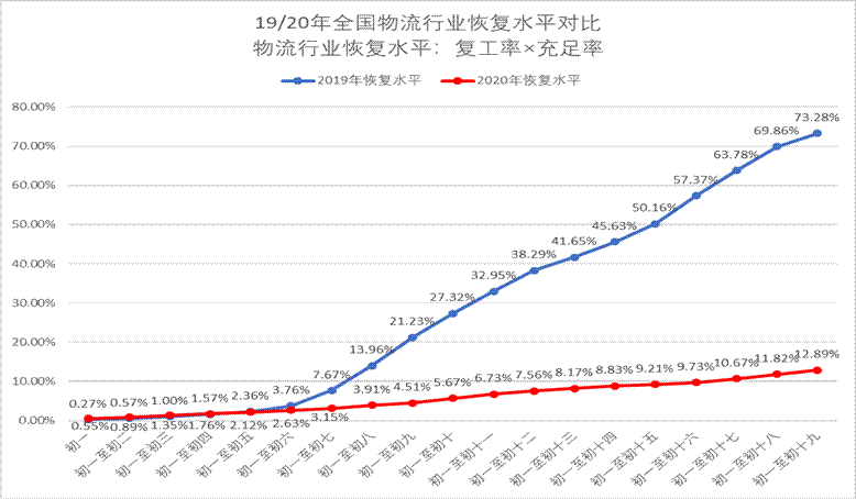 我國物流行業高度市場化,形成了按照春節為起點的周期性的波動,從大年初一開始,物流項目逐漸開工,物流市場也逐漸在正月十五之后進入第一個旺季,為企業生產提供物資基礎。因此,物流行業的節后復工并非如同社會企事業單位有固定時間,而是受市場調節,從大年初一至正月十九,呈現逐步恢復業務體量的形態。觀察今年的物流市場數據情況,已和2019年同期水平差距明顯,市場因疫情影響仍處于低迷期。