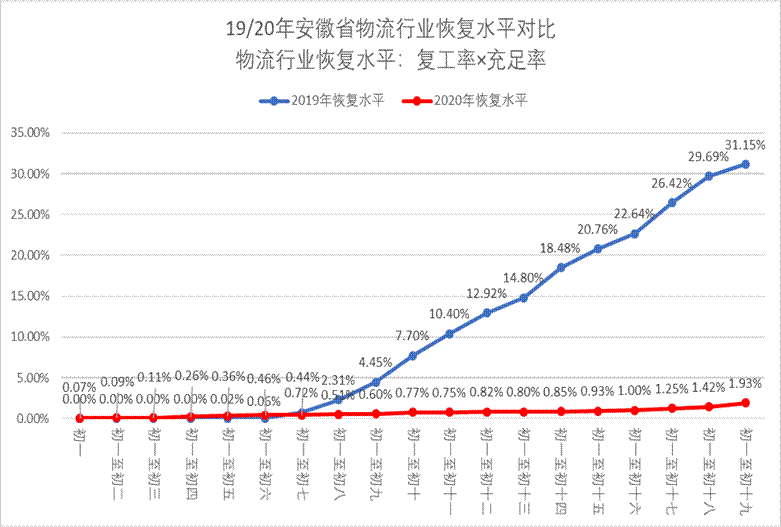 圖中可見,截至2020年正月十九,安徽省物流項目的恢復水平僅有1.93%,與2019年同期有明顯的差距,恢復水平低迷,省內物流運輸業務恢復水平較差,物流項目項目停擺嚴重,可以想見,以此發展,疫情之后安徽經濟的恢復工作將面臨巨大挑戰。