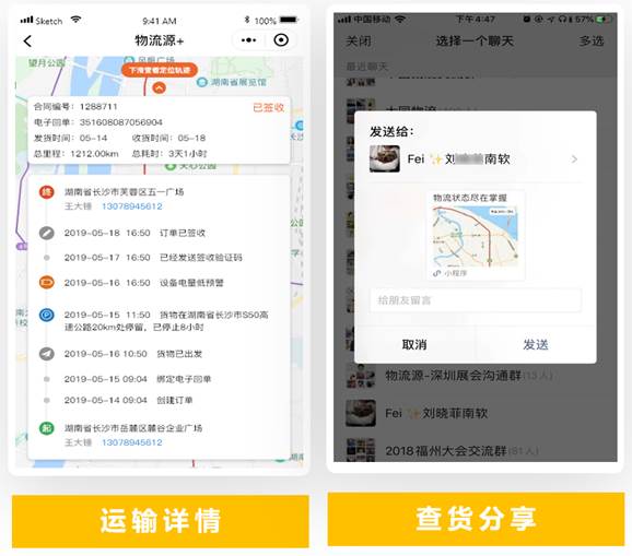 在物流實操環節,只需將物流源電子回單隨貨發出,企業客服就可通過物流源微信公眾號、微信小程序、電腦后臺隨時查詢貨物在途實時位置、全程軌跡、運輸動態(時速、剩余里程)、簽收信息等,并可直接微信分享給相關客戶。