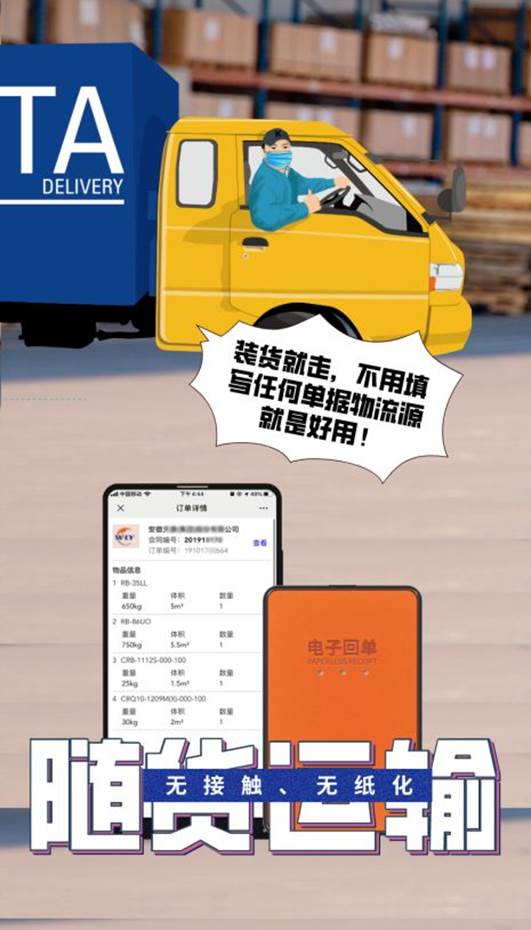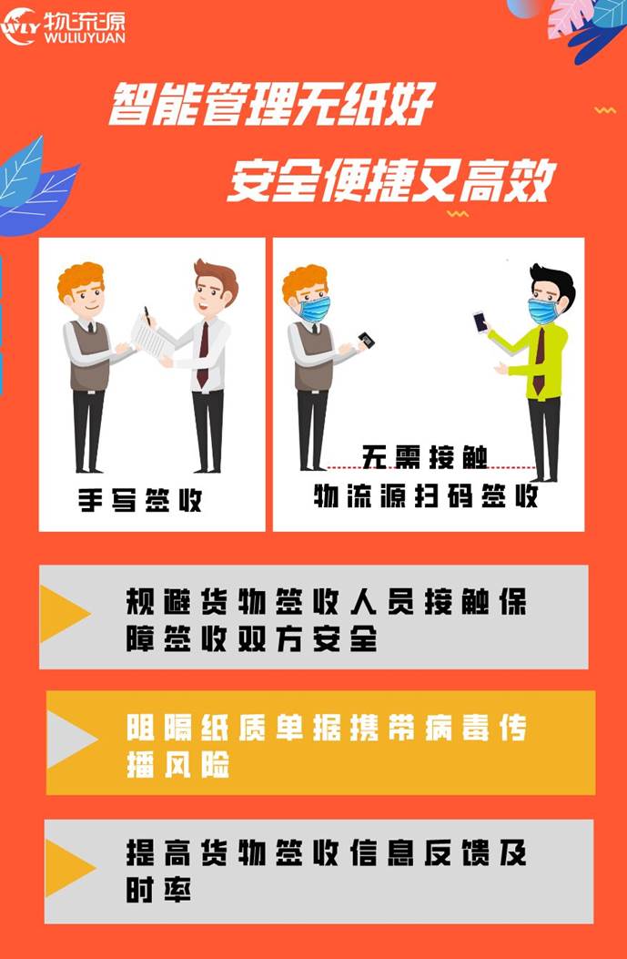 為保障簽收雙方人身安全,物流源采取無紙化簽收模式以減少貨物交接過程中的人員接觸,規避病毒傳播風險,保障交接雙方健康安全。