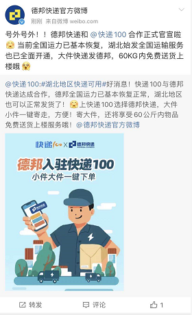 近日,德邦快遞與快遞100聯(lián)合宣布達(dá)成合作,通過快遞100小程序、APP和官方網(wǎng)站等入口,為大眾提供專業(yè)、靠譜的日常寄件、大件物流服務(wù)。隨著后疫情時(shí)代快遞復(fù)工復(fù)產(chǎn)工作推進(jìn),該服務(wù)目前全國已經(jīng)基本恢復(fù),湖北地區(qū)也可以正常發(fā)貨。