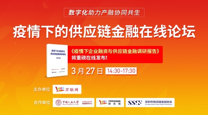 那么,面對肆虐的疫情,供應鏈金融是否可以有效幫助中小企業緩解融資?疫情是否確為供應鏈金融發展的契機?供應鏈金融各參與方又該如何進行在線化、數字化轉型?依托自身產融資源的積累和在線化運營能力,萬聯網將于3月27日舉辦“疫情下的供應鏈金融在線論壇”,邀請國內專家、實戰企業家在線分享、線上對話,推動務實合作,助力疫情下產業融資服務和供應鏈金融發展。