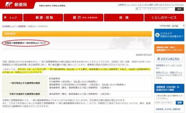 「日本郵政從3月13日0時起,將暫停接收受理發往中國大陸的所有包裹(普通書信文件、明信片及盲人用品除外),船運、航空、EMS、SAL、e特快等國際業務全部暫停收貨,再開時間未定」