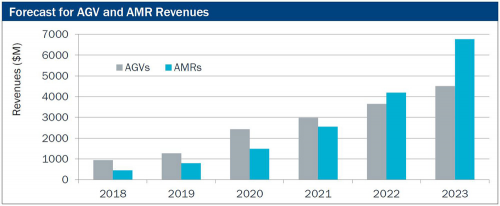 于是,可顯著提升搬運效率同時降低人工成本的機器人迅速發展,其中又以AMR自主移動機器人的智能度最高、最具柔性能力,成為了人工智能在產業垂直落地的風口。據Interact Analysis數據,2023年全球AMR市場將爆發至70億美元。