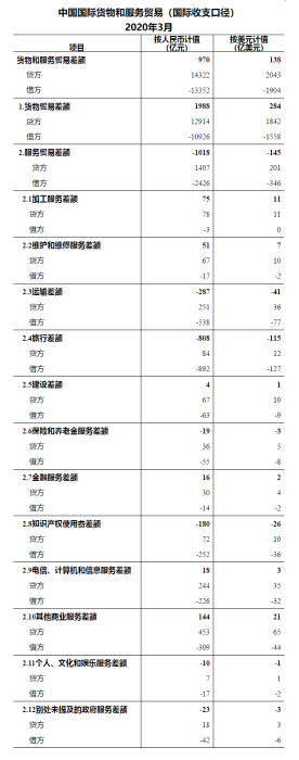 2020年3月,我國國際收支口徑的國際貨物和服務貿易收入14322億元,支出13352億元,順差970億元。其中,貨物貿易收入12914億元,支出10926億元,順差1988億元;服務貿易收入1407億元,支出2426億元,逆差1018億元。