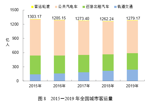 全年完成城市客運(yùn)量1279.17億人,比上年增長1.3%。其中,公共汽電車完成客運(yùn)量691.76億人,下降0.8%,其中BRT完成客運(yùn)量17.47億人,完成公共汽電車運(yùn)營里程354.13億公里,增長2.3%;軌道交通完成客運(yùn)量238.78億人,增長12.2%,完成運(yùn)營車公里41.43億車公里,增長17.5%;巡游出租汽車完成客運(yùn)量347.89億人,下降1.1%;客運(yùn)輪渡完成客運(yùn)量0.73億人,下降9.0%。