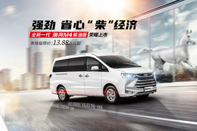 4月18日,全新一代瑞風M4柴油版(2.0 CTI)正式上市,官方售價13.88萬-15.48萬元。在高級營運等級認證的加持下,針對當下消費能力升級和出行觀念逐漸改變的行業市場量身打造。從高性能、高收益、高安全、低使用成本等層面著手解決了出行需求痛點,是瑞風主打出行行業的重磅車型。