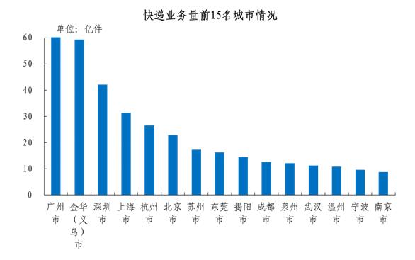 快遞業務量排名前十五位的城市依次是廣州、金華(義烏)、深圳、上海、杭州、北京、蘇州、東莞、揭陽、成都、泉州、武漢、溫州、寧波和南京,其快遞業務量合計占全部快遞業務量的比重達到56.5%。
