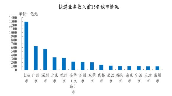 快遞業務收入排名前十五位的城市依次是上海、廣州、深圳、北京、杭州、金華(義烏)、蘇州、東莞、成都、武漢、揭陽、南京、寧波、天津、泉州,其快遞業務收入合計占全部快遞業務收入的比重達到60.7%。