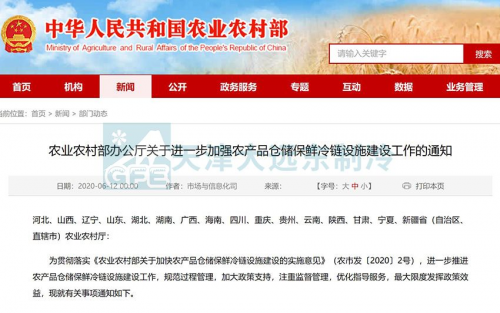 2020年6月12日,農業農村部辦公廳繼續發布《關于進一步加強農產品倉儲保鮮冷鏈物流設施建設工作的通知》;發布服務工作規范,加大政策扶持力度;明確指出:各地要按照“資金跟著項目走”的原則,充分利用好地方政府專項債政策工具,支持加快農產品倉儲保鮮冷鏈設施建設。