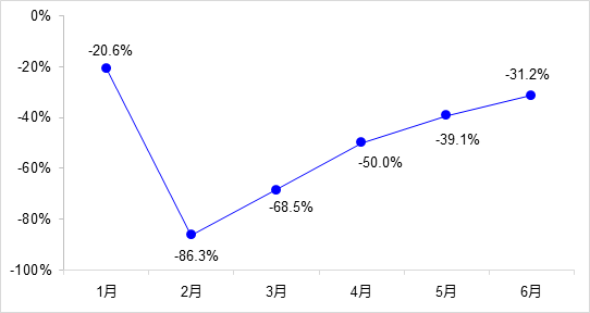 上半年,36個中心城市完成公共交通客運量169.5億人,同比下降48.1%,6月已恢復至去年同期的68.8%,恢復程度較一季度末提高37.3個百分點。分方式看,公共汽電車、軌道交通、巡游出租車和輪渡客運量分別下降50.7%、44.2%、47.6%和57.8%。