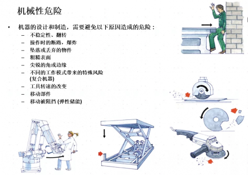 在CE-MD看來,機械性危險主要包括產品設計的不穩定性、翻轉,操作時的斷路、尖銳的角和邊緣、不同工作模式帶來的特殊風險等(詳見下圖)。而AMR屬于機械類產品,所以必須要要符合CE-MD的機械安全要求,按照CE對機械安全的法規要求做機械安全評估。