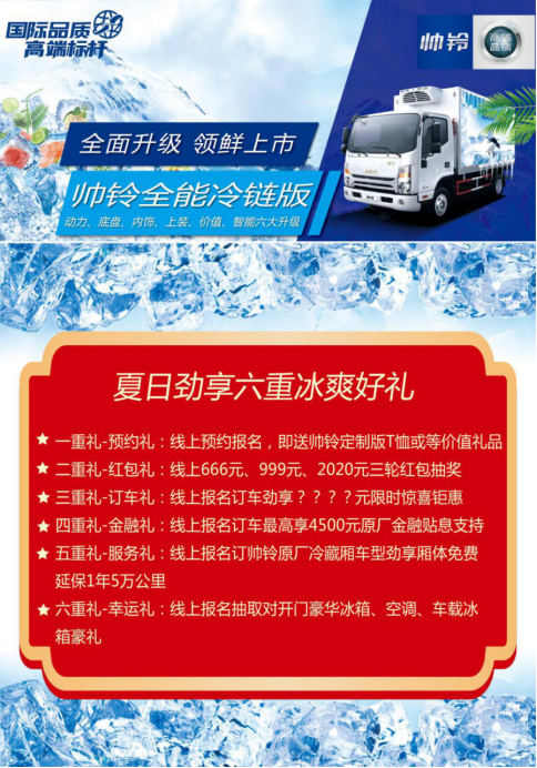 如今,冷鏈運輸逐漸趨于專業化,對于冷鏈運輸車輛的要求也越來越高。帥鈴全能冷鏈版憑借原廠冷藏底盤、上裝、冷機一體化定制化滿足了冷鏈用戶的各種需求。8月16日,帥鈴全能冷鏈版上市直播間六重好禮大放送,驚喜等你揭秘!