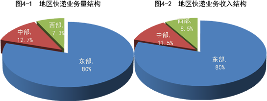 1-7月,東、中、西部地區(qū)快遞業(yè)務(wù)量比重分別為80%、12.7%和7.3%,業(yè)務(wù)收入比重分別為80%、11.5%和8.5%。與去年同期相比,東部地區(qū)快遞業(yè)務(wù)量比重下降0.1個百分點(diǎn),快遞業(yè)務(wù)收入比重下降0.5個百分點(diǎn);中部地區(qū)快遞業(yè)務(wù)量比重上升0.1個百分點(diǎn),快遞業(yè)務(wù)收入比重上升0.4個百分點(diǎn);西部地區(qū)快遞業(yè)務(wù)量基本持平,快遞業(yè)務(wù)收入比重上升0.1個百分點(diǎn)。