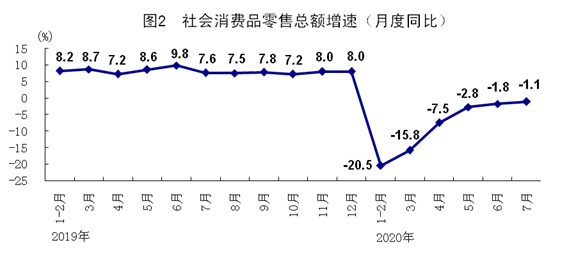 7月份,社會消費品零售總額32203億元,同比下降1.1%,降幅比6月份收窄0.7個百分點;環比增長0.85%。1-7月份,社會消費品零售總額204459億元,同比下降9.9%,降幅比1-6月份收窄1.5個百分點。7月份,按經營單位所在地分,城鎮消費品零售額28025億元,同比下降1.1%;鄉村消費品零售額4178億元,下降1.3%。按消費類型分,餐飲收入3282億元,下降11.0%;商品零售28920億元,增速年內首次由負轉正,增長0.2%。基本生活類商品銷售較快增長。7月份,限額以上單位商品零售額中,飲料類、糧油食品類、日用品類商品同比分別增長10.7%、6.9%、6.9%。消費升級類商品銷售持續改善,7月份,汽車類商品增長12.3%,6月份為下降8.2%;通訊器材類、化妝品類商品分別增長11.3%、9.2%。網上零售持續向好。1-7月份,全國網上零售額60785億元,同比增長9.0%,比1-6月份加快1.7個百分點;其中,實物商品網上零售額增長15.7%,比1-6月份加快1.4個百分點。