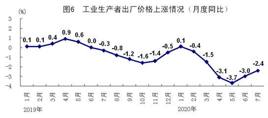 7月份,全國工業生產者出廠價格同比下降2.4%,降幅比6月份收窄0.6個百分點;環比上漲0.4%。工業生產者購進價格同比下降3.3%,降幅比6月份收窄1.1個百分點;環比上漲0.9%。1-7月份,全國工業生產者出廠價格和工業生產者購進價格同比分別下降2.0%、2.7%。