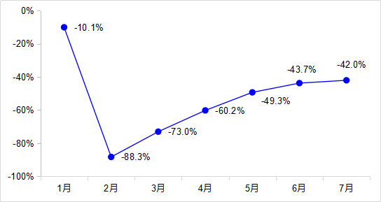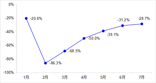 1—7月,完成營業(yè)性客運量48.5億人,同比下降52.9%。其中,公路營業(yè)性客運量下降53.2%、水路客運量下降54.9%。