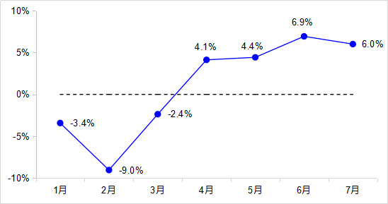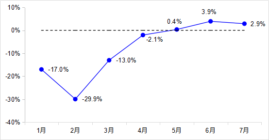 7月,完成貨運量41.2億噸,同比增長2.9%,連續(xù)3個月實現(xiàn)正增長,其中公路貨運量增長3.1%、水路貨運量下降0.3%。