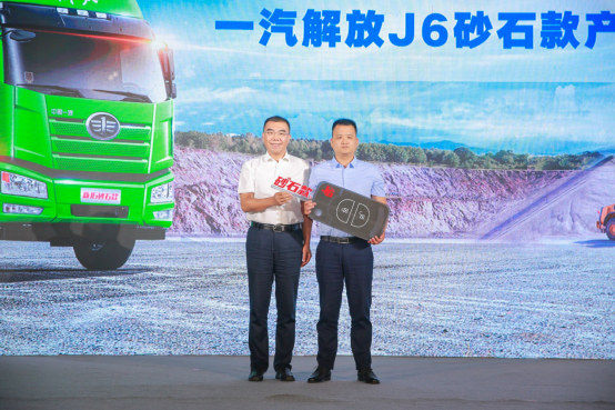 之后,現場還進行了交車儀式,作為J6砂石款首批面世產品,在預售中即獲得了廣大用戶的大力支持,充分展現了一汽解放在廣大用戶中的品牌號召力。現場,由一汽解放汽車銷售有限公司副總經理張松親手為全國首位訂購J6砂石款產品的用戶送上了新車鑰匙,表達著解放攜手用戶、助力用戶創富創贏的美好寓意。