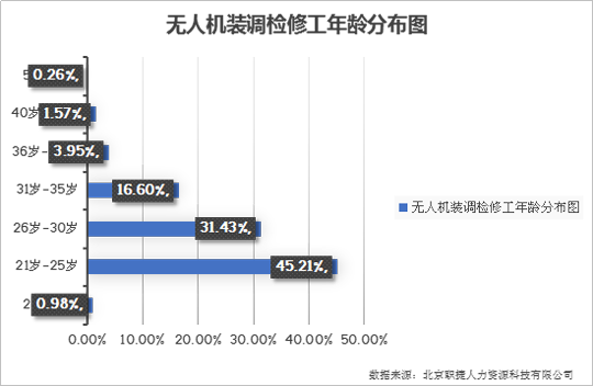 從數據分析,無人機裝調檢修工就業隊伍中21歲-30歲占總人數高達76.64%,其中21歲到25歲之間占就業崗位總人數的45.21%,此類人員大部分都在相關無人機生產企業從事無人機裝調工作。無人機裝調檢修工隊伍的年輕化與實際動手能力需求高度契合崗位的需求,體現無人機裝調檢修工隊伍的特色。