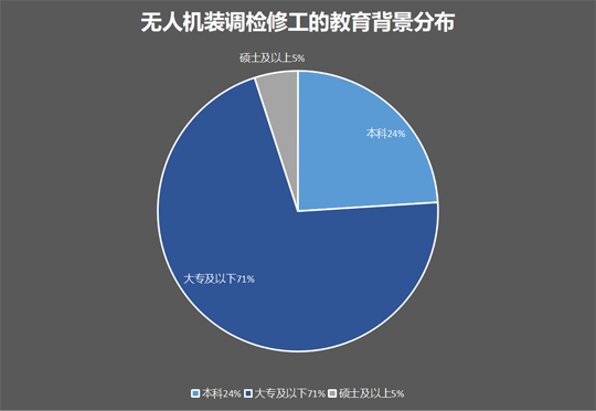 不難發現無人機裝調檢修工的學歷主要為大專及以下,占比71%,無人機裝調檢修工就業門檻低,但是隨著無人機產品的轉型升級,無人機裝調檢修技能型人才缺口日漸顯現,此時“無人機裝調檢修工”新職業推出,可以幫助企業破解轉型升級過程中所面對的人才困境,為企業提供高端人才的有效供給,同時,幫助企業在效益上有所提升,讓企業真正找到“用得起”的人才。