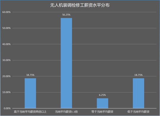 從數據分析,無人機裝調檢修工薪資普遍高于當地平均薪資,75%無人機裝調檢修工薪資是當地平均工資1-3倍,隨著中國民用無人機的國內外良好的市場發展勢頭,對無人機生產和售后服務人才的需求越來越大,去年南方某招聘會上,主辦方透露與前年相比,去年的技術技工類崗位的招聘薪酬稍有上升趨勢,升幅為5%至20%。“無人機裝調檢修工”的誕生,不僅能改變人才供不應求的狀態,還能讓從事無人機裝調檢修工作的技術人才真正進入規模化發展,是無人機相關人才需求體系成型的一個重要信號。
