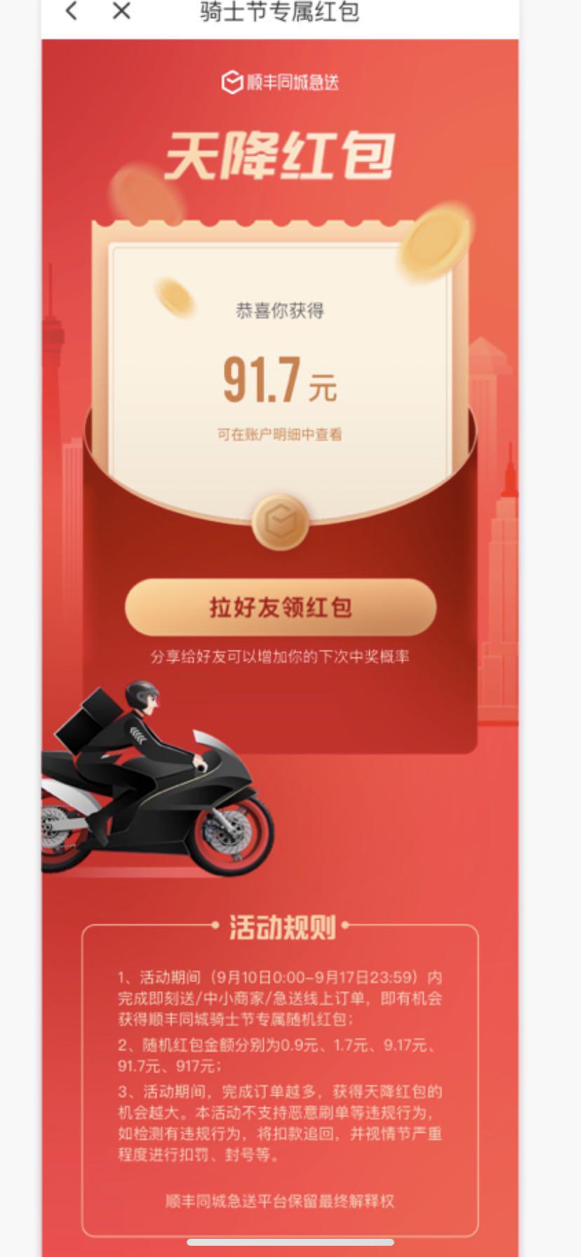 9月10日0:00點(diǎn)至9月17日23:59,為期一周的騎士節(jié)天降紅包活動(dòng)將正式開(kāi)始。騎士們?cè)诨顒?dòng)期間完成即刻送/中小商家/急送線上訂單,即有機(jī)會(huì)獲得順豐同城騎士節(jié)專(zhuān)屬隨機(jī)紅包。