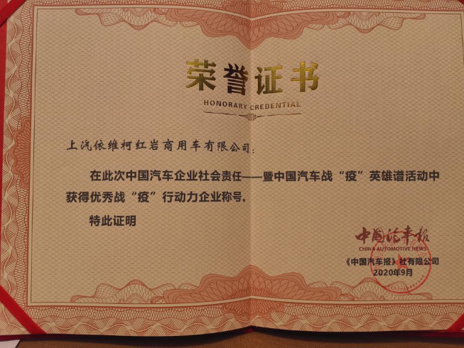 2020年9月10日,由《中國汽車報》社主辦的中國汽車企業社會責任暨中國汽車戰“疫”英雄譜頒獎典禮在北京隆重舉行。上汽依維柯紅巖商用車有限公司(以下簡稱“上汽紅巖”)在疫情期間的防疫抗疫舉措和復工復產成績得到了社會和行業的高度認可,榮獲“優秀戰‘疫’行動力企業”稱號。