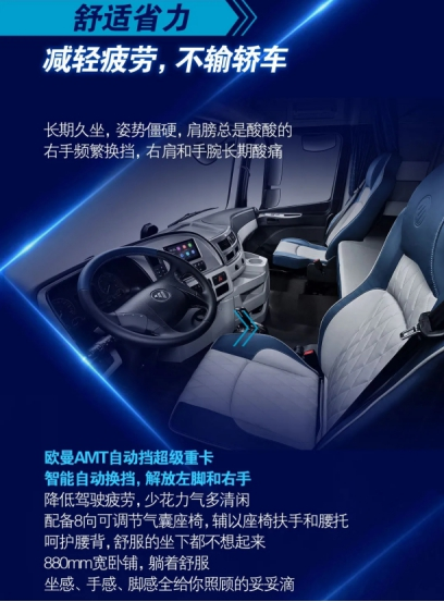 歐曼AMT重卡不僅可以通過降低駕駛強度,提升舒適度,而且還匹配了氣囊懸浮減震座椅,帶有充放氣、減震阻尼調節和氣動腰部支撐,可以有效保護駕駛員腰部;標配自動空調,帶有液晶顯示屏,操作面板簡單,功能豐富;880mm寬大柔軟臥鋪,方便駕駛員休息。