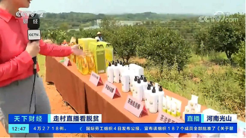 圖:CCTV2央視財(cái)經(jīng)頻道直播報(bào)道九展品牌參加河南光山縣產(chǎn)品展播
