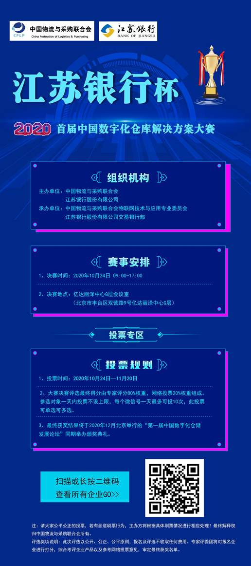 2020年10月24日,“江蘇銀行杯-首屆中國數字化倉庫解決方案大賽”總決賽在北京的中國物流與采購聯合會舉行,全國共有 25個單位代表進入總決賽。