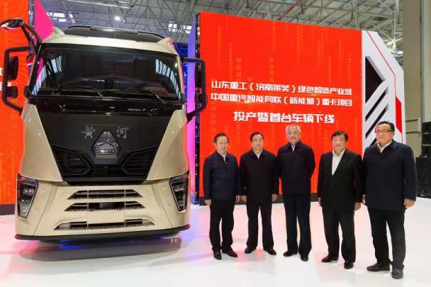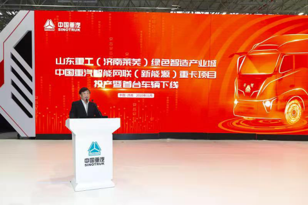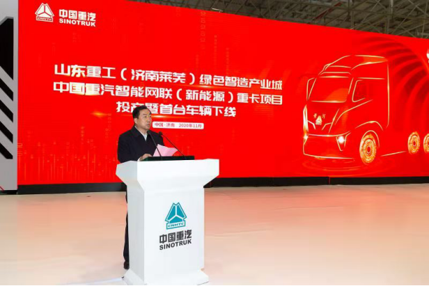 2020年11月19日上午9時(shí),山東重工(濟(jì)南萊蕪)綠色智造產(chǎn)業(yè)城—中國(guó)重汽智能網(wǎng)聯(lián)(新能源)重卡項(xiàng)目投產(chǎn)暨首臺(tái)車輛下線儀式在該項(xiàng)目總裝車間隆重舉行。隨著屏幕緩緩開啟,一輛剛剛組裝下線的新一代黃河重卡緩緩駛到舞臺(tái)中央,標(biāo)志著中國(guó)重汽智能網(wǎng)聯(lián)(新能源)重卡項(xiàng)目正式投產(chǎn)。