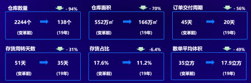 安得一盤貨帶來的價值有多驚人?數字可以論證。張亞明介紹,“在經歷一盤貨物流變革后,美的全國銷售渠道的倉庫數量從2244個減少到138個,而且138個倉庫的渠道數據全部在系統之中;倉庫面積從552萬平米降到了166萬平米;訂單交付周期從45天減到20天,滿足了美的T+3快速交付;庫存周轉的天數從51天降到了35天,這代表著更少占用渠道資金;存貨占比從17.6%下降到11.2%,意味著安得智聯用更少的渠道庫存支撐了更大的市場銷售規模;散單平均體積從35立方下降到17.9立方,即從‘大批量少批次’變成了‘小批量多批次’,這也是T+3訂單生產以后帶來的另一效應。”