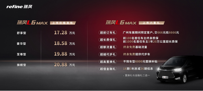11月20日,“20萬(wàn)級(jí)前驅(qū)超空間商務(wù)MPV”瑞風(fēng)L6 MAX于廣州車展正式上市,定價(jià)17.28萬(wàn)元-20.88萬(wàn)元。作為瑞風(fēng)品牌全新旗艦車型和瑞風(fēng)“L”系列第一款產(chǎn)品,瑞風(fēng)L6 MAX兼具前置前驅(qū)專業(yè)底盤(pán)、超大多維空間、20萬(wàn)級(jí)商務(wù)氣質(zhì)三大亮點(diǎn)。面對(duì)不斷商務(wù)化的市場(chǎng)趨勢(shì)和日益精細(xì)化的用戶需求,瑞風(fēng)L6 MAX的入場(chǎng)將帶來(lái)“大 有前程”的中高端公商務(wù)出行體驗(yàn),創(chuàng)造出兼具品質(zhì)感和高價(jià)值的出行解決方案。