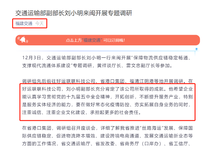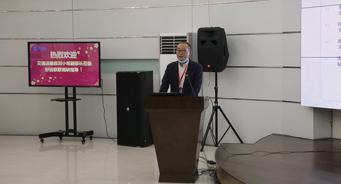 12月3日,交通運輸部副部長劉小明一行來閩開展“保障物流供應鏈穩定暢通、支撐現代流通體系建設”專題調研。期間,交通運輸部副部長劉小明、運輸服務司副司長王繡春、福建省交通運輸廳廳長黃祥談、副廳長雷文忠、福建省運輸事業發展中心主任馮振秀等領導一行首站蒞臨好運聯聯調研指導,好運聯聯董事長郭敏、總裁郭斌對領導一行進行熱情接待。
