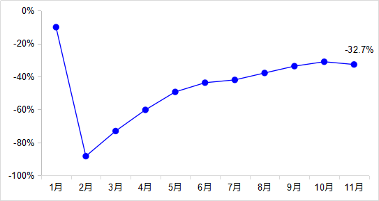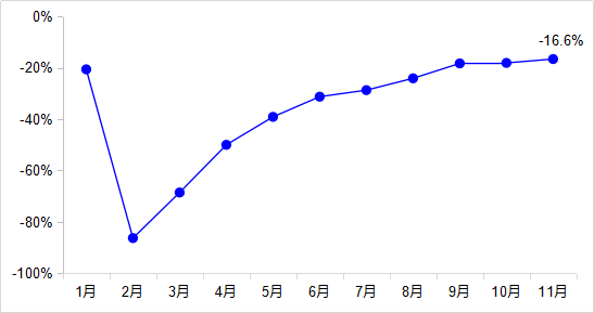 1—11月,完成營業(yè)性客運量88.0億人,同比下降45.9%,其中公路營業(yè)性客運量下降47.6%、水路客運量下降46.1%。