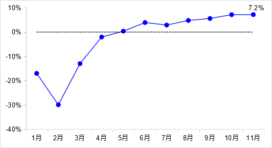 11月,完成貨運量46.5億噸,同比增長7.2%,增速與10月持平,其中公路貨運量增長8.4%、水路貨運量增長4.1%。