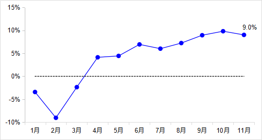 11月,全國港口完成貨物吞吐量13.2億噸,同比增長9.0%,仍處于近年來較快增長水平,其中內(nèi)、外貿(mào)吞吐量分別增長11.8%和2.7%。完成集裝箱吞吐量2417萬標(biāo)箱,同比增長8.8%。