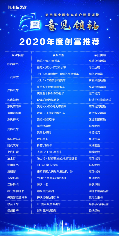 從這個視覺維度出發(fā),卡友的意見對于整車企業(yè)的發(fā)展至關(guān)重要。因此,《卡車之友網(wǎng)》結(jié)合全年度在各大卡車行業(yè)細分領(lǐng)域的深度調(diào)查,代表權(quán)威專家、物流企業(yè)以及不同卡友的中肯評價及推薦意見,在第四屆“卡車客戶運營調(diào)查——中國卡車意見領(lǐng)袖頒獎盛典”中頒發(fā)了年度推薦車型、年度推薦動力、油品及輪胎等系列獎項??梢灶A見的是,獲得這些榮譽的商用車企業(yè),必將繼續(xù)載譽前行,創(chuàng)造出讓更多行業(yè)客戶喜歡的產(chǎn)品,與此同時,這些系列榮譽的授予,也為整個商用車行業(yè)的正向發(fā)展帶來可資借鑒的思想風潮和現(xiàn)實范本。
