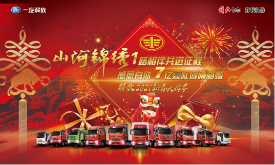 新春送暖,陪你過年!新春來臨之際,一汽解放期待與卡友們攜手共創豐收幸福年!2021年2月4日,農歷“小年”這一天上午,一汽解放誠邀粉絲相聚解放直播間,帶大家悉數了解“解放2021新春大拜年”的多重禮遇和關愛措施。解放“新春大拜年”系列活動寵粉不斷,驚喜連連,以最大的誠意回饋多年來支持與信賴解放的車主朋友,除夕到初六,7億豪禮蓄勢待發,屆時請您關注解放官微和新春抽獎活動,相信您會有意想不到的收獲!