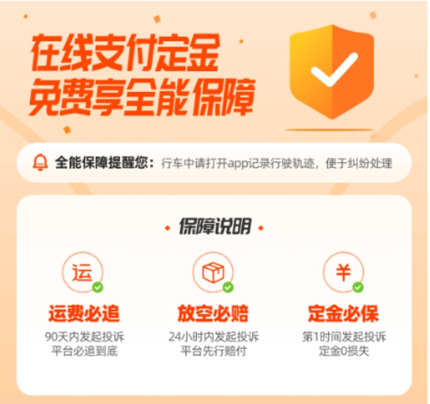 “放空”是貨運行業專有名詞,可通俗理解為司機接貨時“白跑一趟”?!胺趴毡刭r”即專門保障因貨主原因導致的車輛放空情況,司機可進行在線申訴,平臺會在定責后按照標準賠付給司機,在提高訂單成交率的同時,保障司機的運輸權益。
