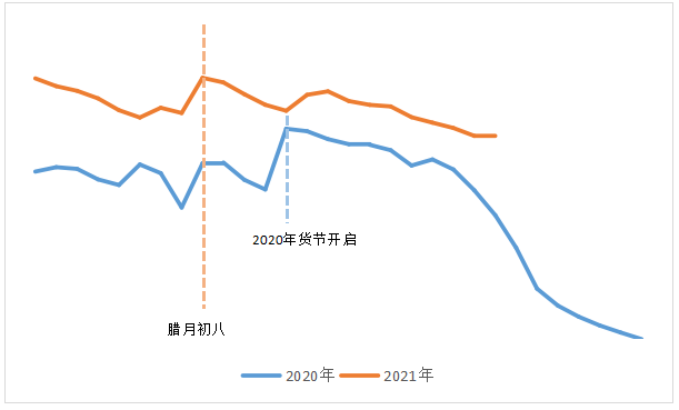 2020年及2021年農(nóng)歷“臘八”前后快遞量趨勢圖