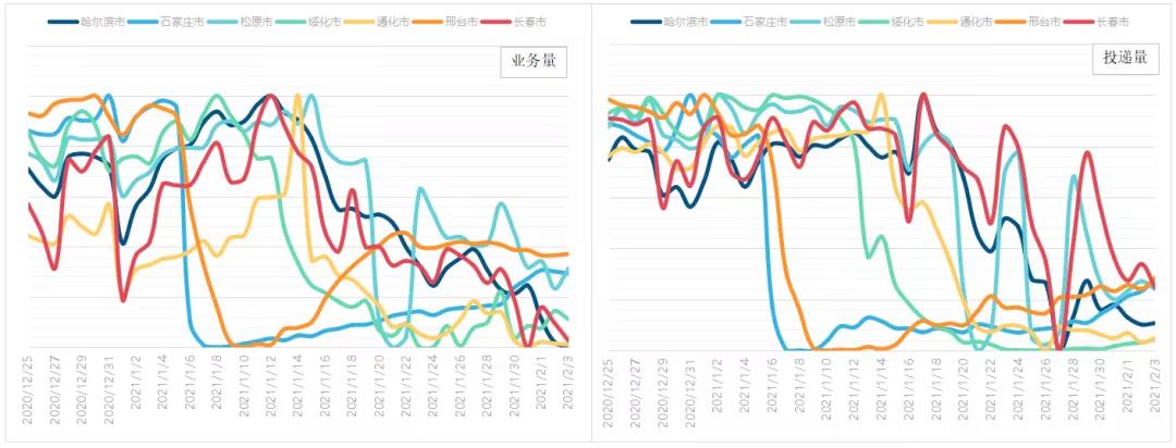 石家莊、邢臺(tái)、哈爾濱、綏化、長春、松原、通化等受疫情影響的城市,快遞業(yè)務(wù)量恢復(fù)情況呈現(xiàn)不同狀態(tài)。通過對(duì)數(shù)據(jù)進(jìn)行分析我們發(fā)現(xiàn),相較于去年12月底,河北石家莊、邢臺(tái)兩市快遞量在1月6日左右出現(xiàn)斷崖式下降,14日左右逐步恢復(fù)。目前石家莊市業(yè)務(wù)量恢復(fù)約三成左右,邢臺(tái)業(yè)務(wù)量恢復(fù)約四成左右,長春、哈爾濱基本恢復(fù)80%,綏化市恢復(fù)一成左右。投遞方面,長春、哈爾濱、松原恢復(fù)情況基本和業(yè)務(wù)情況保持一致,通化、邢臺(tái)、石家莊、綏化受疫情管控因素及人員不足等因素影響,投遞量恢復(fù)情況弱于業(yè)務(wù)量恢復(fù)情況。
