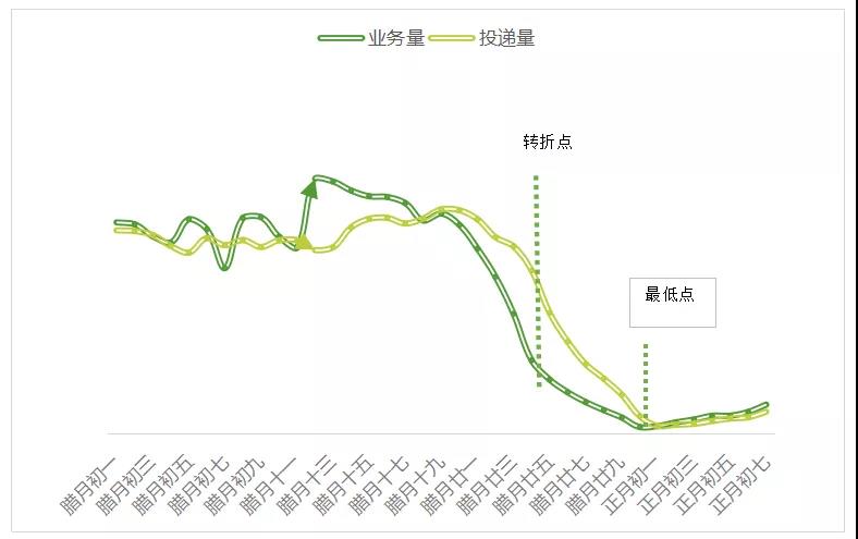 結(jié)合往年數(shù)據(jù),臘月二十四前后快遞量、投遞量出現(xiàn)轉(zhuǎn)折點(diǎn),呈急劇下降的情況,在除夕、大年初一迎來最低點(diǎn)。今年受多種因素影響轉(zhuǎn)折點(diǎn)或?qū)⒀雍螅汗?jié)前后最低點(diǎn)預(yù)計(jì)仍出現(xiàn)在除夕及大年初一,但整體仍呈均衡趨勢,收寄時(shí)效將略受影響或?qū)⒌陀诋?dāng)前水平。