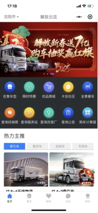 春節(jié)鎖定解放云店,足不出戶樂(lè)享7億豪禮!為吉慶熱鬧迎新年,一汽解放自元旦便在線上線下籌備“新春大拜年”等多個(gè)鉅惠活動(dòng),以十足的誠(chéng)意感恩回饋用戶對(duì)解放的支持與信賴,并連續(xù)三年在春節(jié)假期檔開展線上“新春抽獎(jiǎng)”,助力卡友們新一年在事業(yè)上開運(yùn)招財(cái),大展宏圖。牛年除夕至初六(2月11日-17日),關(guān)注一汽解放官微/短視頻平臺(tái),登錄“解放云店”購(gòu)車,便可線上抽取總價(jià)值7億元的新年購(gòu)車紅包,并享受相應(yīng)線下購(gòu)車優(yōu)惠。