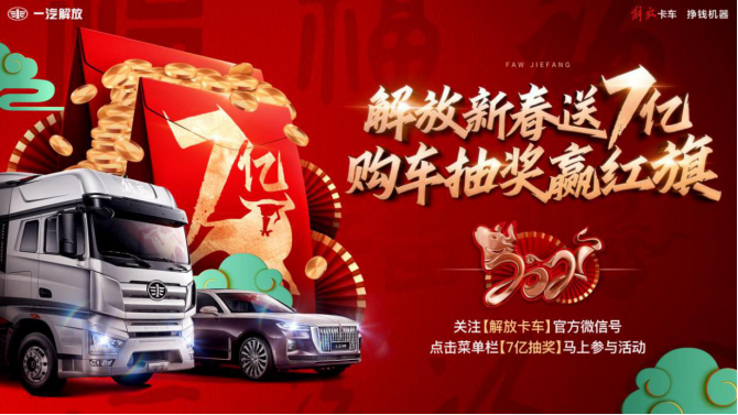 在喜慶的節(jié)日氣氛中,一汽解放拜賀新春的“重頭戲”也將拉開帷幕,那就是攜7億豪禮向全國(guó)卡友們送出2021年的新春福利!連續(xù)七天在線上派送“紅包”,祝卡友們新年財(cái)源滾滾,喜事連連!除夕至初六(2月11日-2月17日),及時(shí)關(guān)注一汽解放官微/短視頻平臺(tái),登錄解放云店購(gòu)車,即可抽取解放7億新春購(gòu)車紅包,還有機(jī)會(huì)免費(fèi)把紅旗轎車開回家。這樣的驚喜就從明天(大年除夕)開始,想購(gòu)買新車的卡友快來(lái)拼手氣吧!